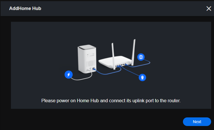 1. The App will prompt you to power on and connect the Hub to the network, as shown in the image below. Once confirmed, tap Next to continue.